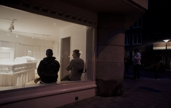 Op de begane grond, tussen de geopende gordijnen en volkshuizen van Amsterdam West, creëerde Reed van Brunschot een site-specific installatie dat volledig van zijn kleur is ontdaan. “The Living Room” is een luchtig sculptuur gemaakt van wit papier met replica’s van versieringen en objecten die gebruikt worden bij de wake.